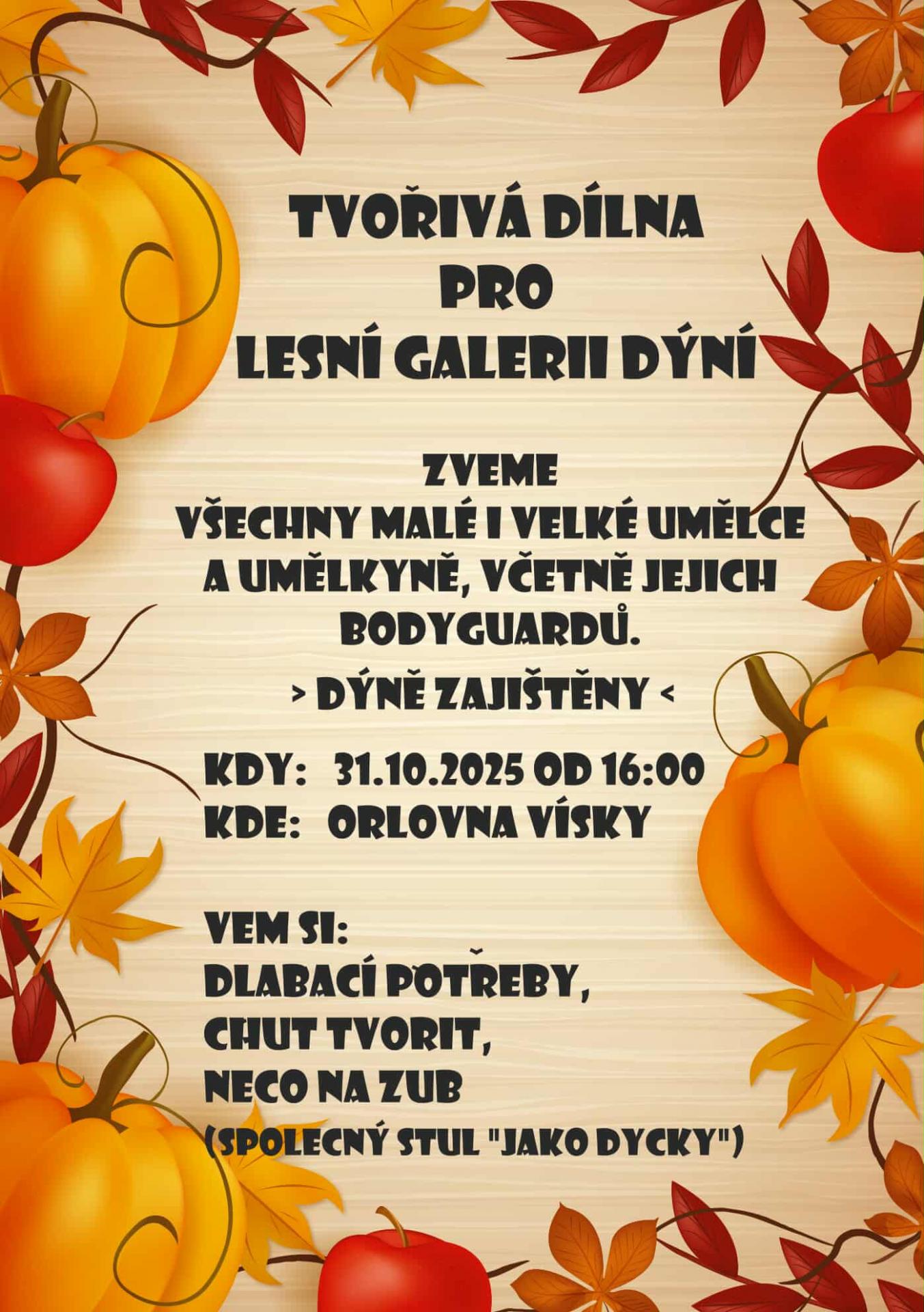 31.10. od 16 hodin v Orlovně - Tvořivá dílna 1.11. od 18 hodin ve stříbrné - Lesní galerie dýní